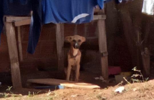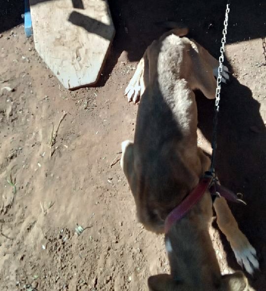 Ao analisarem o quintal, viram um cachorro sem raça definida, de aproximadamente um ano, que estava muito magro e não tinha água nem comida. O animal ainda estava amarrado com uma corrente curta.