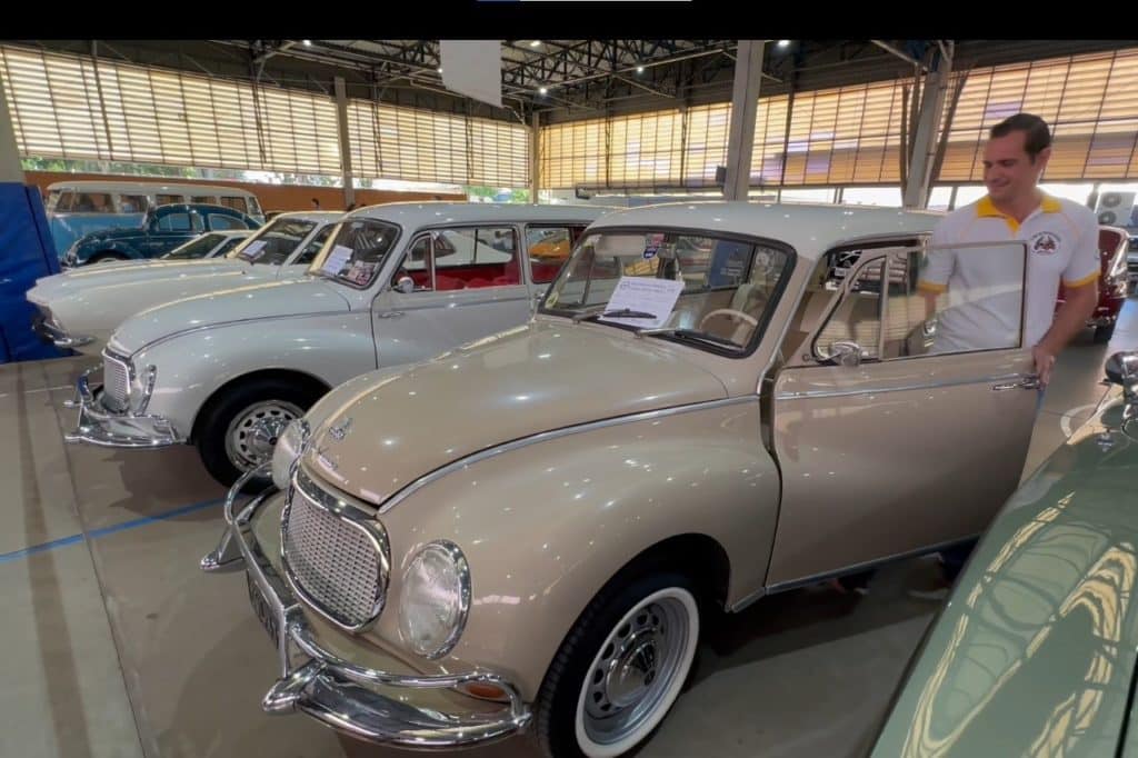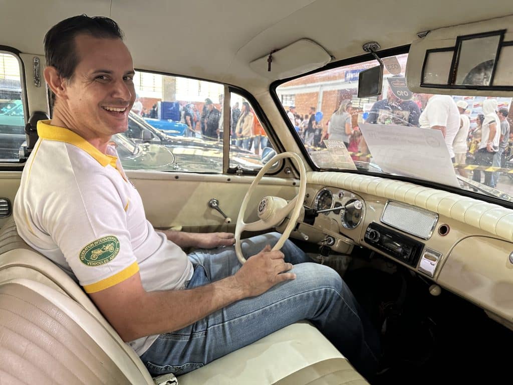 Fala com orgulho do carro ser nacional: “Foi o primeiro veículo, em 1956, fabricado no Brasil com 80% das peças fabricadas aqui. Trazido por Juscelino Kubitschek através da Vemag Equipamentos Agrícolas, por isso o carro foi batizado com esse nome – Vemag”.