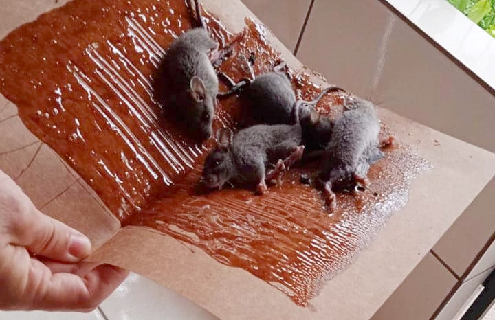 Imagem encaminhada pelos moradores mostra armadilha colocada em uma das casas com vários ratos capturados.