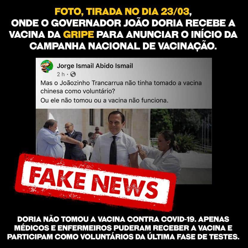 Em sua conta no Twitter, Doria informou que, na verdade, tomou somente a vacina contra a gripe: “Ao ler diversas Fake News nas redes após a divulgação do meu diagnóstico de coronavírus, esclareço que não tomei a vacina Coronavac. Apenas médicos e enfermeiros que estão em contato com pacientes com Covid-19 receberam a aplicação da vacina nesta última fase de testes”. E completou: “Estou indignado com posturas extremistas e mentirosas, que em nada contribuem para o combate à pandemia.