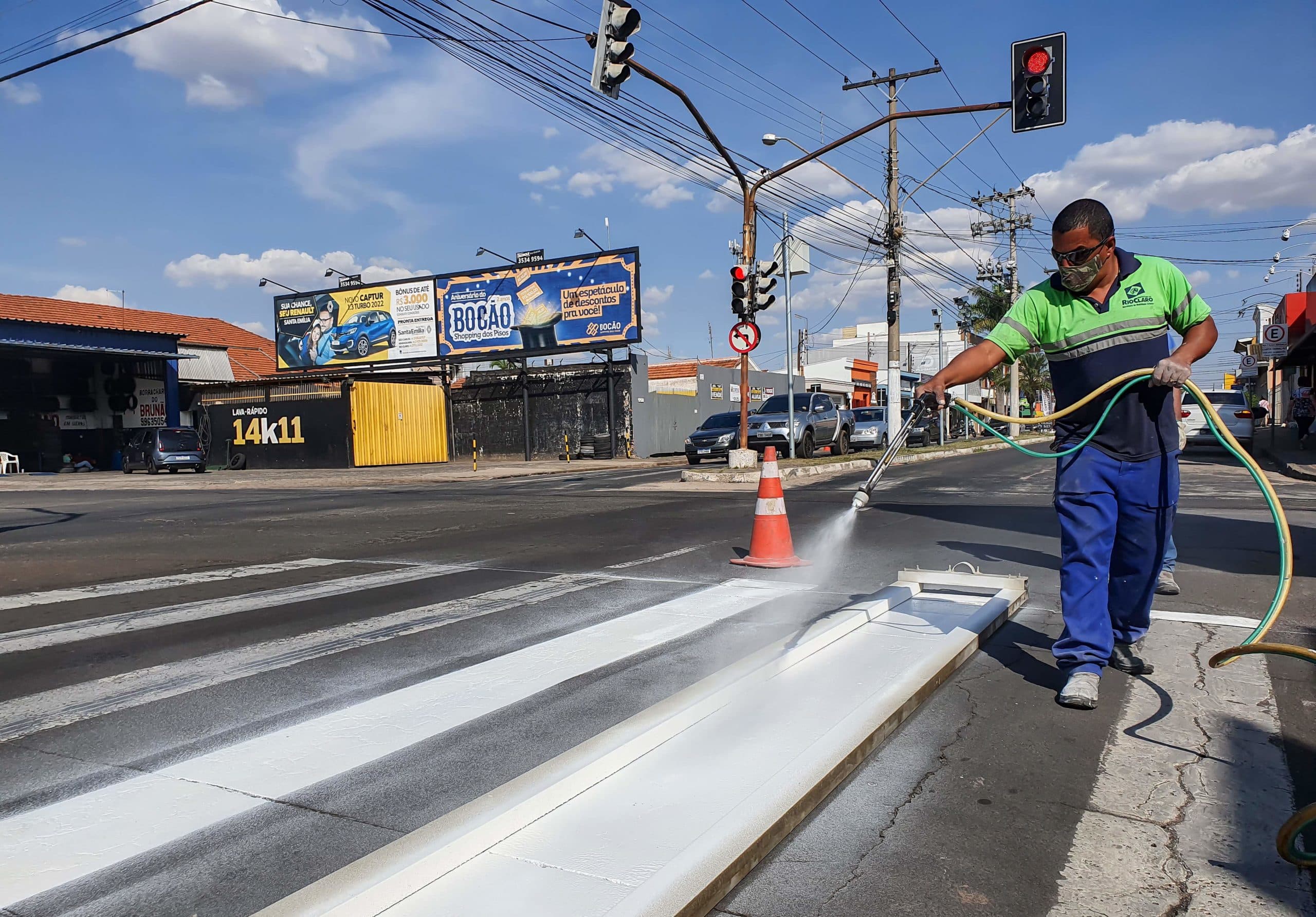 Após os serviços na parte de drenagem, a prefeitura realizou ações de recomposição, reforço e ampliação da sinalização de solo, com pintura de faixas de pedestres, delimitação de área destinada a motocicletas nas paradas de semáforos e de demarcação divisória das faixas de trânsito ao longo do trecho.