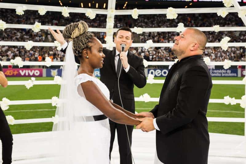 “Celebrei esse casamento na Arena Corinthians, diante de 40 mil torcedores, no intervalo entre o jogo Corinthians x Grêmio. Foi uma gravação para o quadro ‘Felizes para Sempre’, do Caldeirão do Hulk. Os noivos Tamara e Daniel tinham o sonho de se casarem em plena Arena, e o então técnico [Fábio] Carille ajudou a realizar esse sonho”, conta o celebrante.