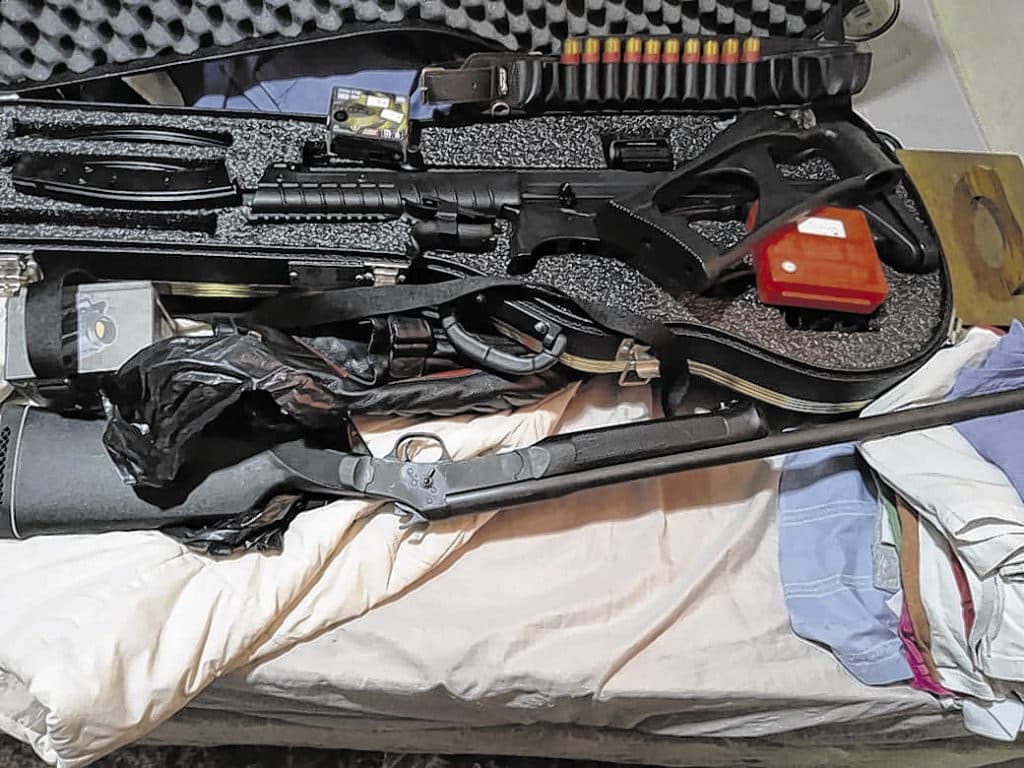 Foram apreendidas uma espingarda calibre 12, um fuzil com três carregadores, um carregador de pistola 9mm, uma coronha adaptável para pistola, munições de diversos calibres, um notebook, um coldre e um aparelho DVR.