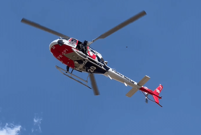 O helicóptero Águia da Polícia Militar auxilia no atendimento de uma ocorrência de roubo a residência, na tarde desta quarta-feira (29), em Rio Claro. O crime aconteceu no bairro Jardim Portugal, onde armas foram levadas.