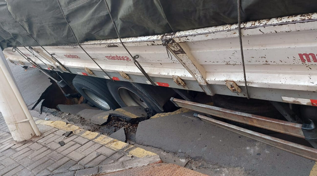 Um caminhão que estaria carregado com uma carga de açúcar refinado caiu em um buraco após o asfalto ceder na manhã desta quinta-feira (24), na Avenida 1, entre as ruas 5 e 6, no Centro de Rio Claro.