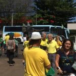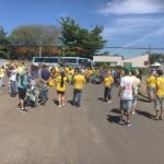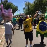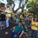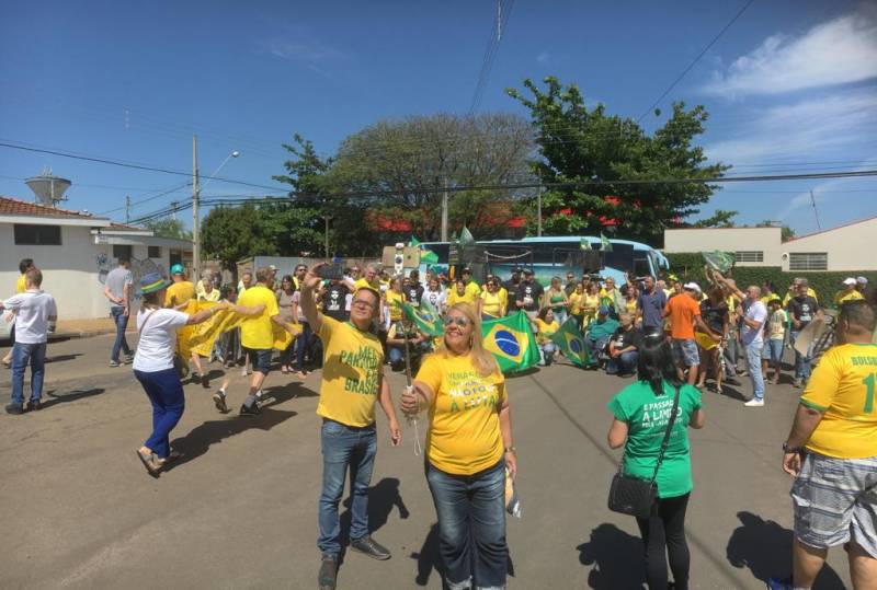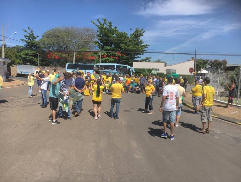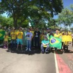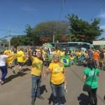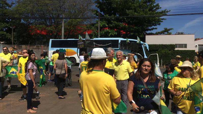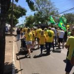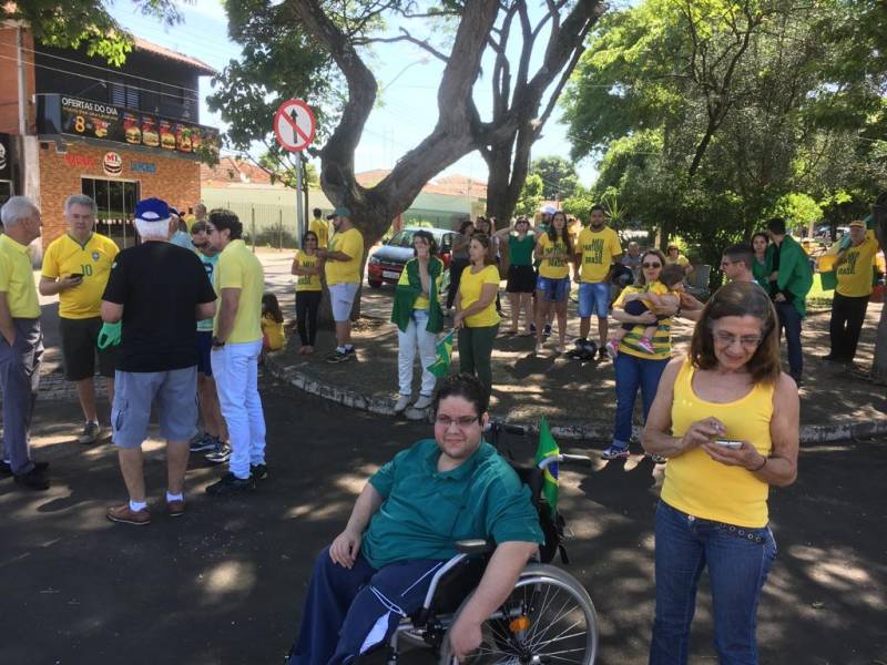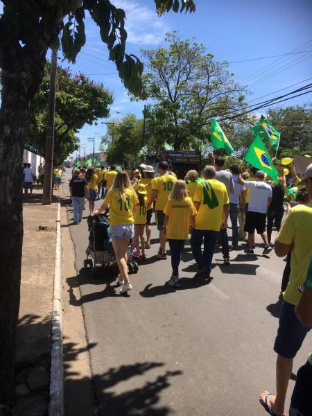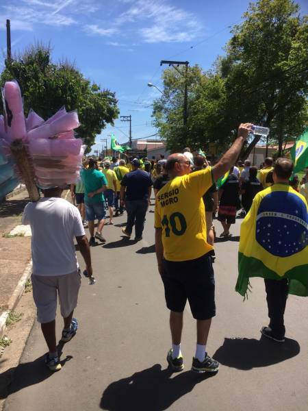 Um grande grupo de pessoas caminha neste momento em direção ao balão da Avenida 50, em Rio Claro. Os manifestantes participam do ato “PT Não”, que teve início às 9 horas, com uma concentração na praça do Jardim do Ipê, localizada na Rua 3-A com a Avenida 42-A.
