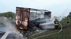 Caminhão fica destruído após pegar fogo na Rodovia SP-310