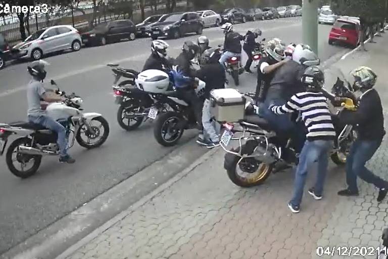 Pelas imagens do circuito interno, é possível ver quando dois criminosos chegam de moto e abordam as vítimas. Eles se dirigem para o homem que está com uma moto BMW de GS 1250 cilindradas, avaliada em mais de R$ 100 mil, e determinam a entrega do veículo.