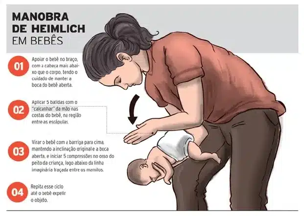 Em bebês a manobra é feita de forma diferente. O primeiro passo é deitar a criança sobre o braço com a cabeça um pouco mais baixa que o tronco e observar se existe algum objeto em sua boca que possa ser removido. Caso contrário, e ela continuar engasgada, deve-se incliná-la, com a barriga sobre o braço, com o tronco mais baixo que as pernas, e dar 5 palmadas com a base da mão nas suas costas. Se ainda assim não for suficiente, deve-se virar a criança de frente, ainda sobre o braço, e efetuar compressões com os dedos médio e anular sobre o tórax da criança, na região entre os mamilos.