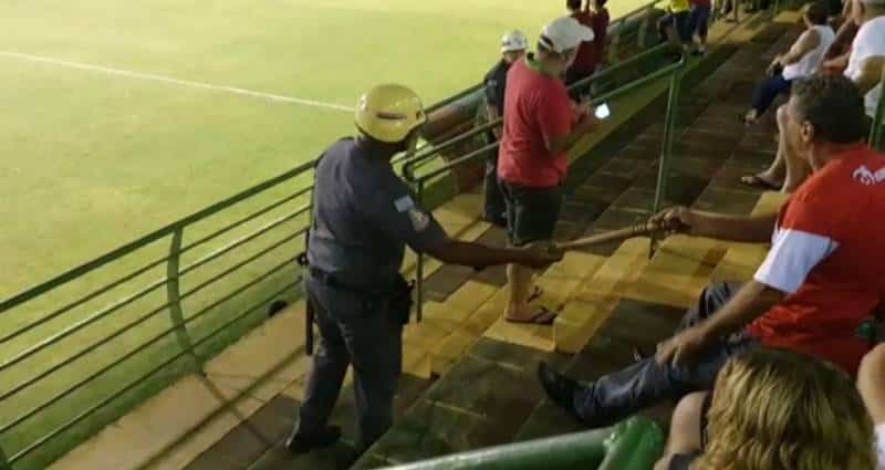 Em dado momento da partida de terça (28), a ação da PM ao retirar a bengala de Valter foi filmada por outros torcedores. Confira: