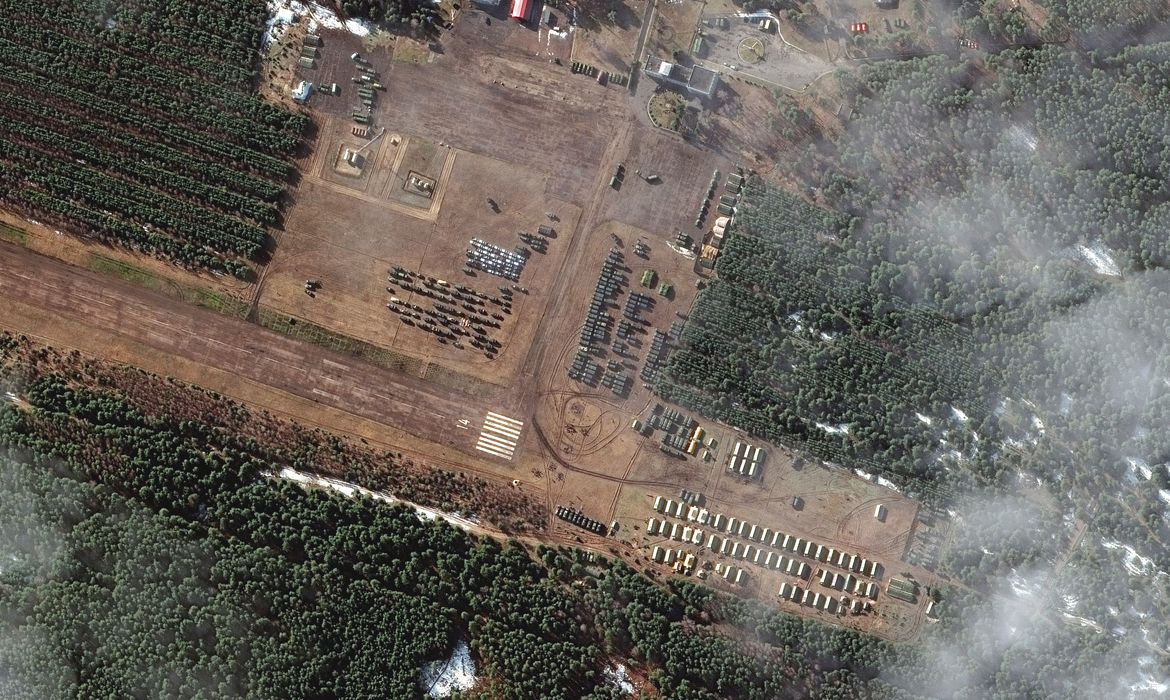 Uma imagem de satélite mostra uma visão geral de uma nova implantação no aeródromo V D Bolshoy Bokov, perto de Mazyr, Bielorrússia