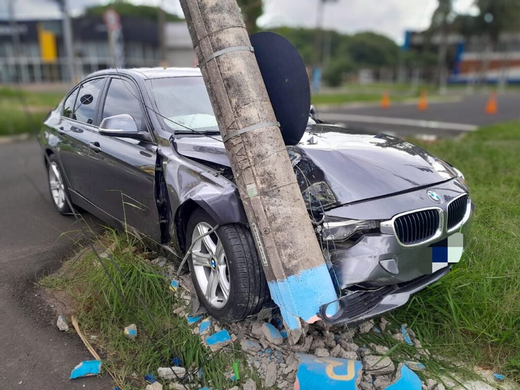 BMW colide com poste na Avenida Tancredo Neves em Rio Claro