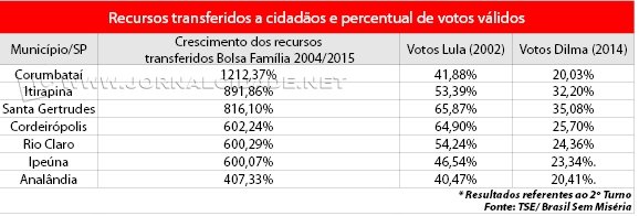 Entre 2004 e 2015, o município que registrou maior aumento no valor da soma de todos os benefício do programa foi Corumbataí, com aumento de 1.212,37% no período. Ao mesmo tempo, se em 2002 Lula (PT) obteve 41,88% dos votos válidos, no segundo turno, na cidade, ano passado, Dilma Rousseff (PT) registrou 20,03% dos votos válidos no segundo turno.