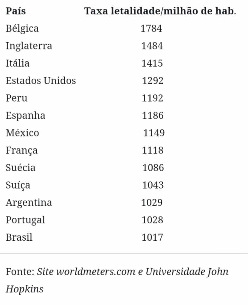 O líder em letalidade é a Bélgica com taxa de 1.784 mortes por milhão de habitantes. Países com alto IDH (Índice de Desenvolvimento Humano), como Suíça, Inglaterra, Estados Unidos, Suécia e França, também têm taxas de morte por milhão de habitantes superiores ao do Brasil.