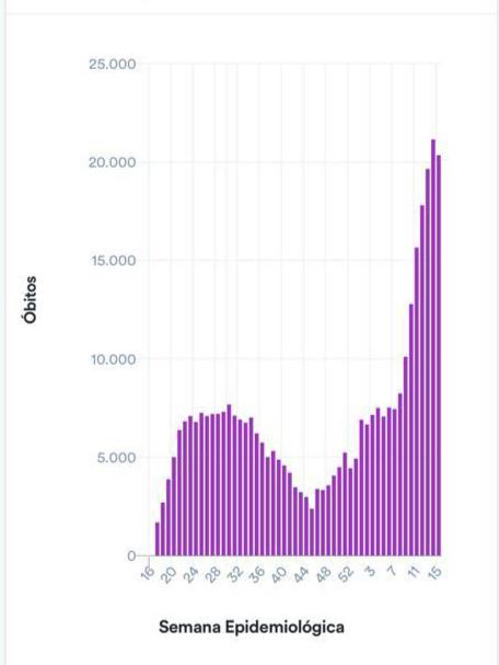Os dados oficiais são do Ministério da Saúde e registram um total de 20.344 mortes na semana 15, contra 21.141 mortes registradas por Covid-19 na semana anterior.
