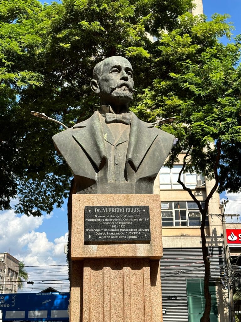 Quem passa pelo Jardim Público, pelo trecho da Avenida 3, certamente já reparou num imponente monumento que está instalado ao centro elevado da praça. Trata-se do busto do médico e fazendeiro Alfredo Ellis (1850-1925), que foi citado dezenas de anos atrás como o dono da maior fazenda de café das Américas. Obra é de autoria do artista plástico ítalo-brasileiro Vilmo Rosada, que chegou em Rio Claro em 1934, aos 29 anos de idade, onde fez carreira e é considerado um dos filhos ilustres do município.
