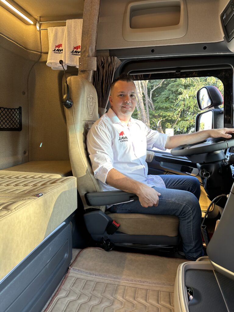 Mário Rogério Nunes, sócio proprietário da Java Couros, aborda detalhes do processo e as emoções envolvidas nessa jornada de 30 dias de trabalho: “Desmontamos toda a cabine, revestimos teto e fundo, tudo personalizado e reforçado com materiais originais. Cada detalhe foi pensado para manter a essência do padrão original da Scania, porém com um toque exclusivo. Fizemos o revestimento dos bancos, logomarca exclusiva, costura programada e tudo no padrão da nossa empresa.”