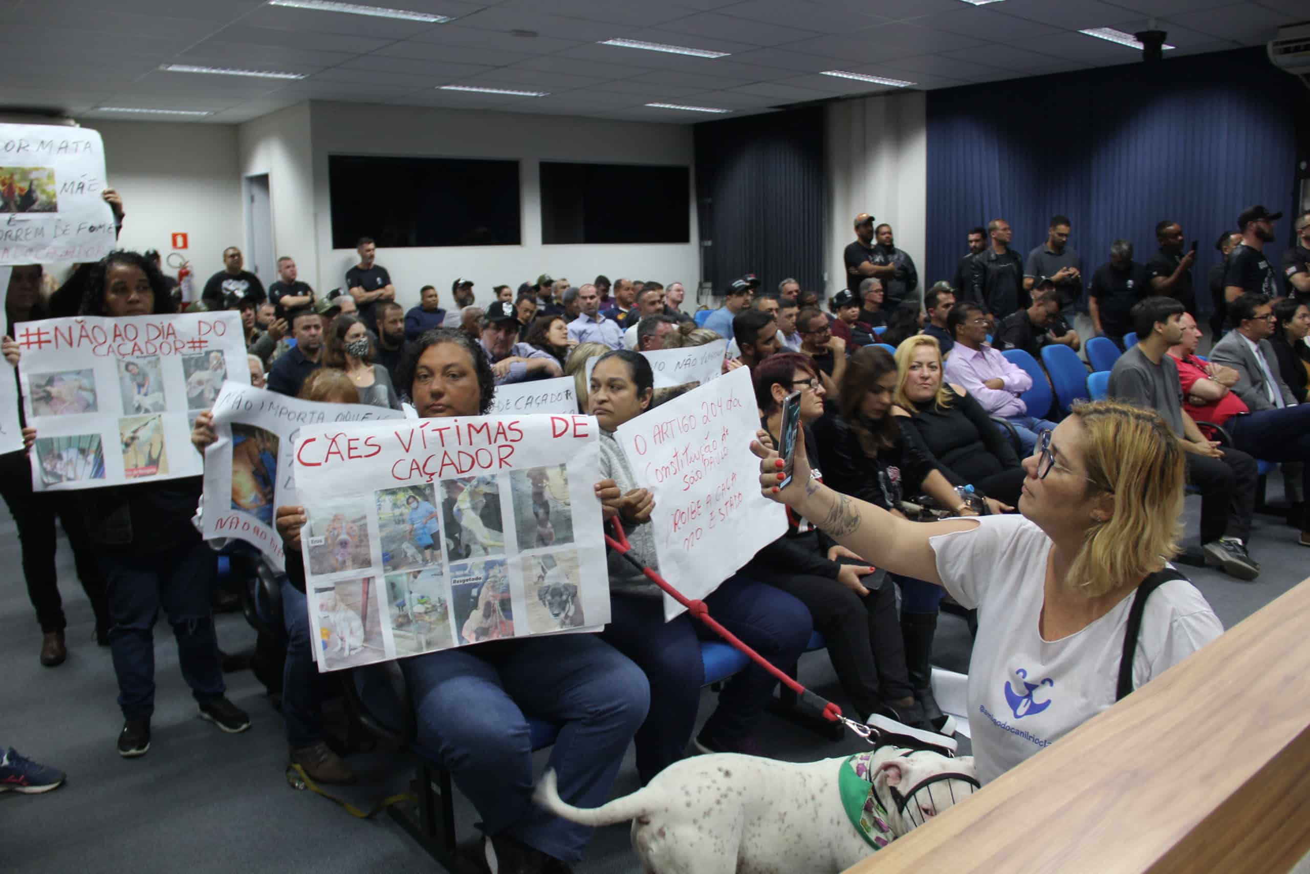 Até mesmo um cachorro foi levado para sensibilizar os vereadores. O animal foi resgatado após ter sido abandonado por um caçador, segundo informaram. O primeiro projeto, de autoria do vereador Rodrigo Guedes (União Brasil), que cria o Dia dos Colecionadores, Atiradores e Caçadores no calendário oficial do município, a ser celebrado em 9 de julho, foi aprovado novamente, porém, com a retirada do termo “caçadores”.