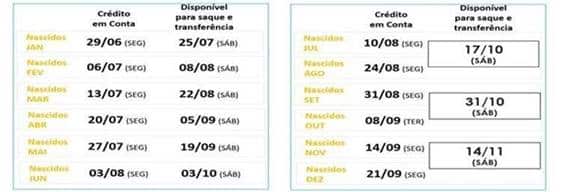 O calendário foi estabelecido com base no mês de nascimento do trabalhador, e teve início em 29 de junho, com os nascidos em janeiro. A partir da data de crédito dos valores na conta Poupança Social Digital, os recursos podem ser utilizados em transações eletrônicas, e posteriormente, na data para saque e transferência, os valores remanescentes ficam disponíveis para saque em espécie ou transferência, sem custo, para outras contas.