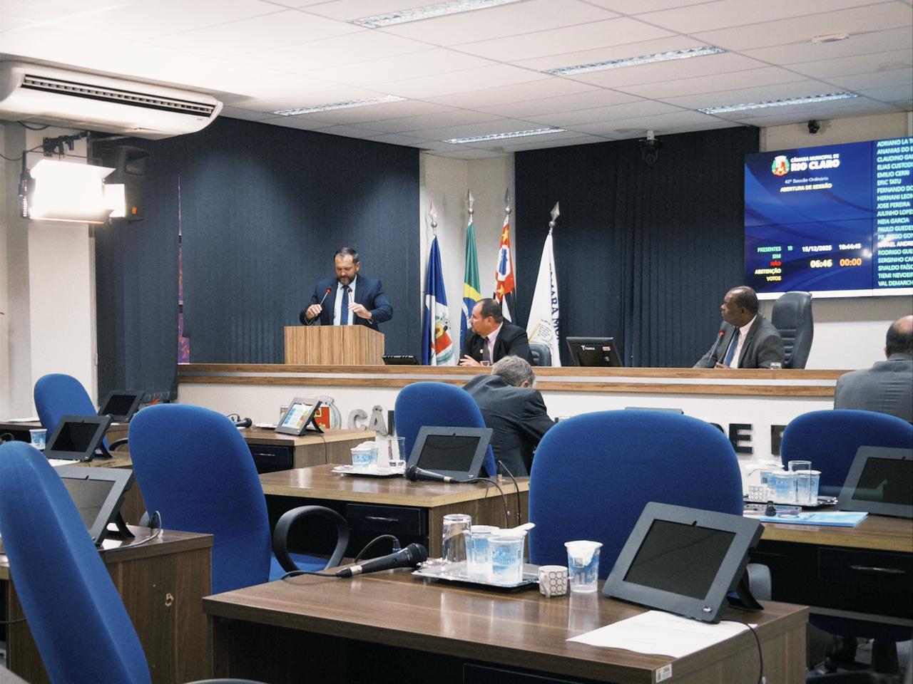 A Câmara Municipal de Rio Claro realizou na noite dessa segunda-feira (15) a última sessão ordinária do ano. Agora, as sessões só voltam oficialmente em fevereiro, porém, até lá as extraordinárias poderão ser convocadas caso sejam necessárias. Na ‘despedida’ de ontem, poucos foram os vereadores que discursaram. A base governista teceu alguns comentários gerais sobre o trabalho próprio que foi realizado por cada um, mas a oposição novamente marcou ‘território’ em críticas sobre o Governo Gustavo.
