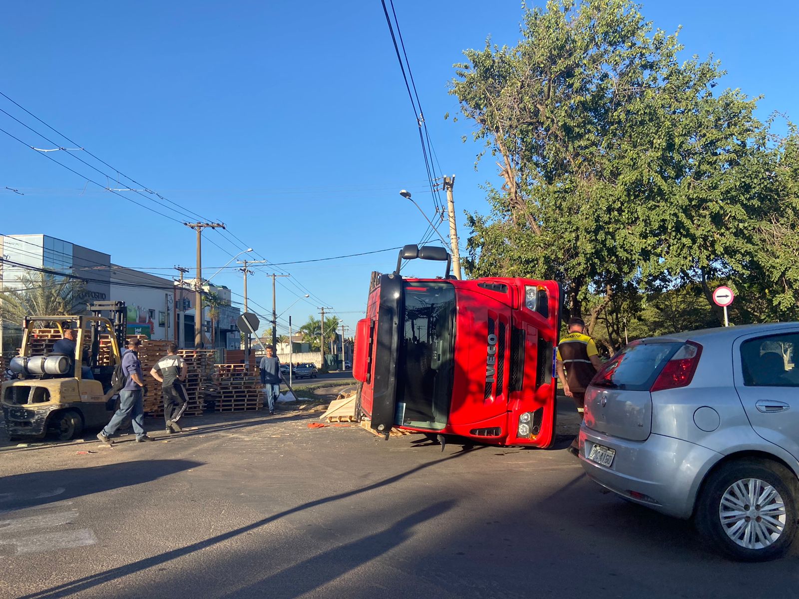 O veículo, que estava carregado com paletes de madeira, tombou e parte da carga se espalhou pelo local. Apesar do susto o motorista não se feriu.