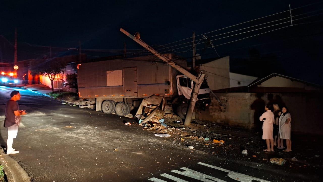 Um caminhão baú que estava estacionado na Avenida 52, no bairro Santa Elisa, perdeu o freio e acabou atingindo a fachada de um imóvel na madrugada deste sábado (8). O impacto derrubou parte do muro, rompeu a rede de água e também derrubou um poste de energia elétrica.