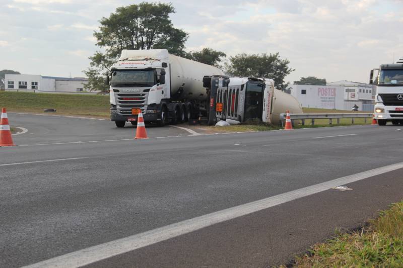 Caminhão tomba em alça de acesso entre as rodovias Fausto Santomauro e Washington Luís