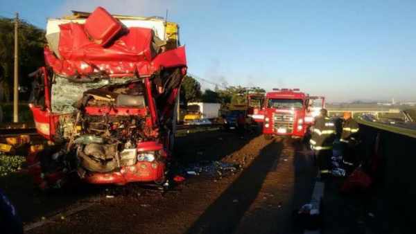 Um caminhão carregado com caixas de limão colidiu na traseira de um segundo veículo, carregado de ração em grãos, na manhã desta terça-feira (14), no quilômetro 168 da Rodovia Washington Luís, a SP-310, em Santa Gertrudes.
