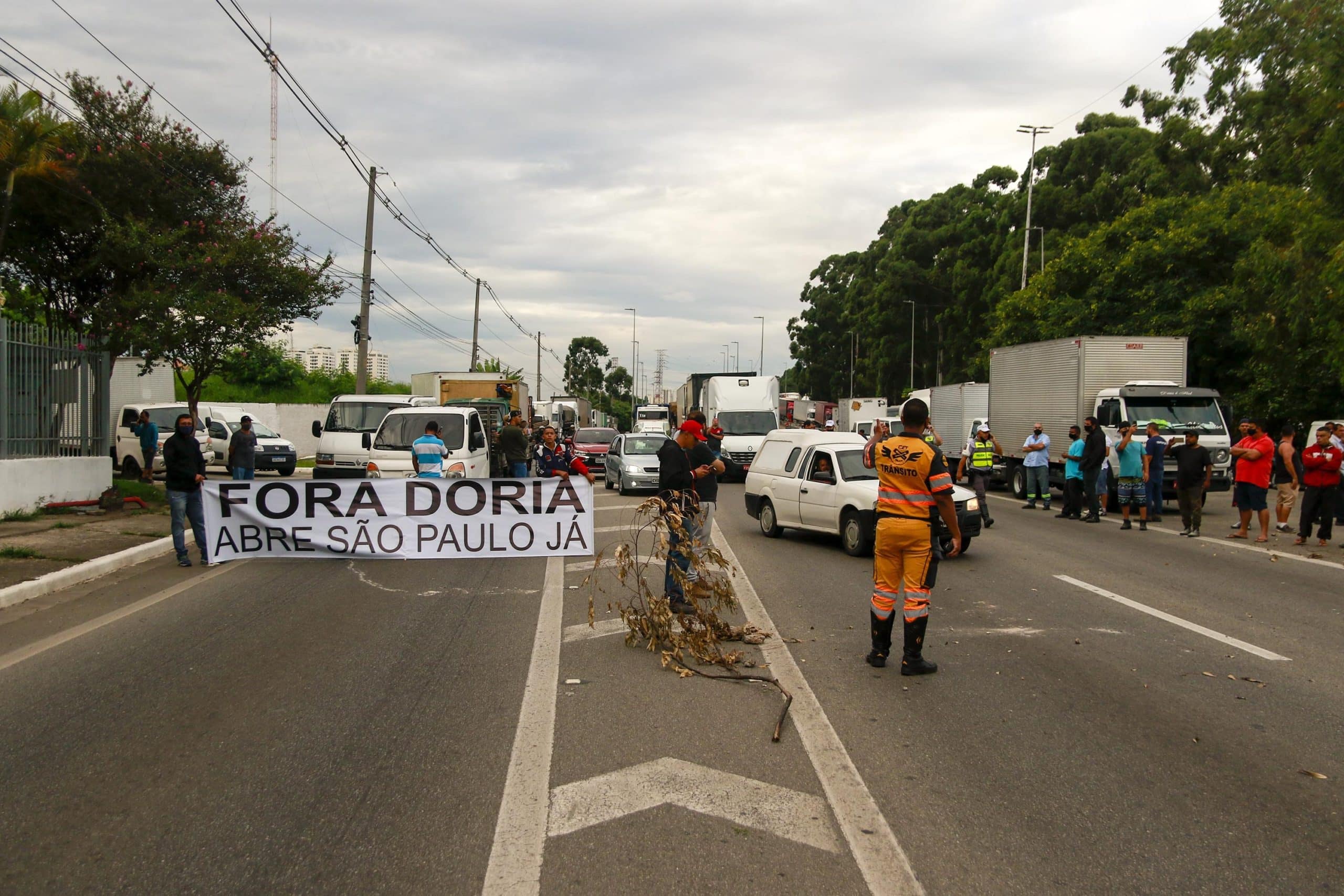 Caminhões e vans estão parados nas três faixas da via – central, expressa e local, liberando apenas carros de passeio e motos. Os manifestantes seguram faixas contra o governador João Doria (PSDB).