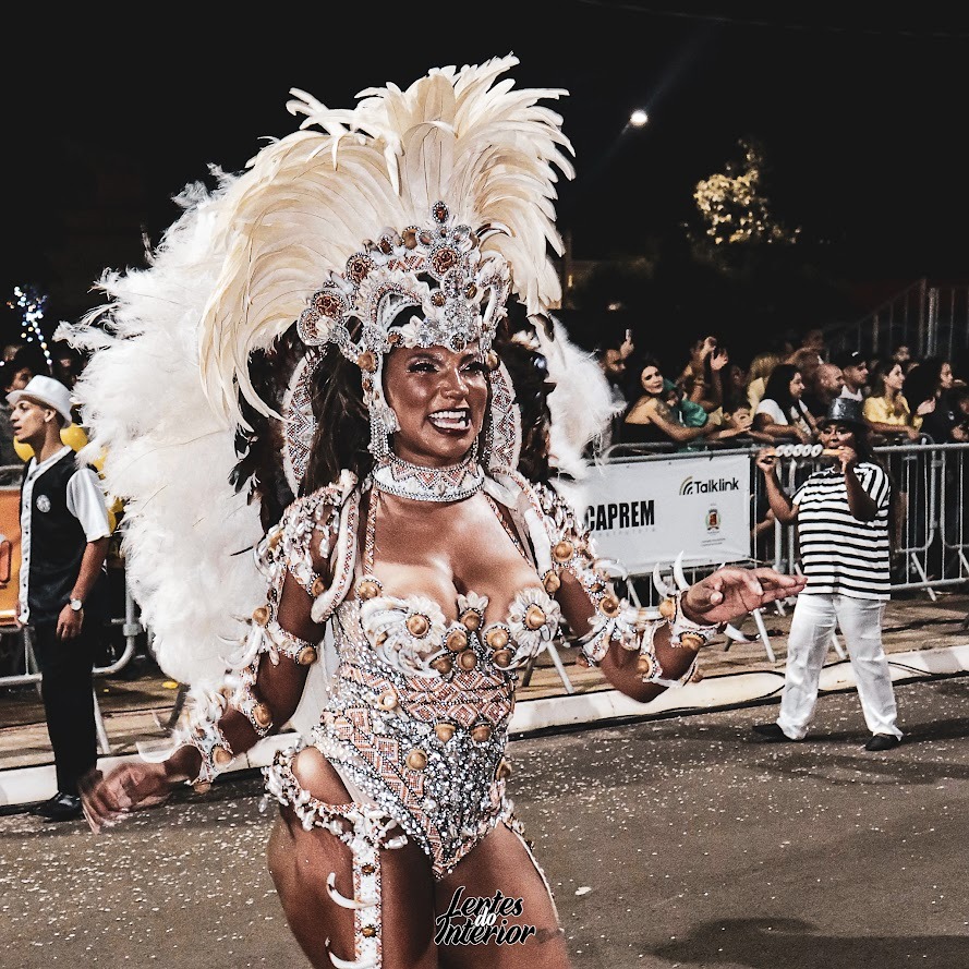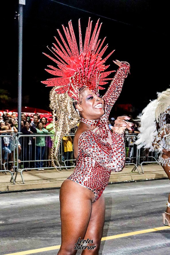 Miriani Cruz carrega com força e entusiamo o título de rainha da bateria, Juliana Ribeiro dos Santos, de musa e Carla Cristina Siqueira, de princesa.