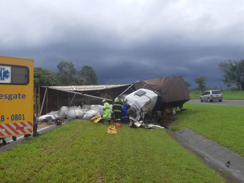 O motorista ficou preso nas ferragens mas foi retirado consciente e orientado e encaminhado a atendimento médico.
