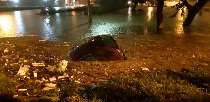 Em consequência da forte chuva na noite desta sexta-feira (4), um automóvel ficou parcialmente submerso na Avenida 16, no Jardim São Paulo.