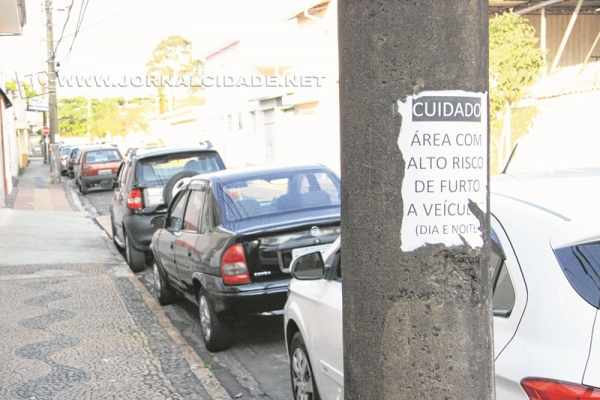 Uma espécie de cartaz foi colocado em um poste, na Avenida 12 entre as ruas 1 e 2, no centro de Rio Claro. Dele constam os dizeres: “Cuidado: área com alto risco de furto a veículos (dia e noite)”.