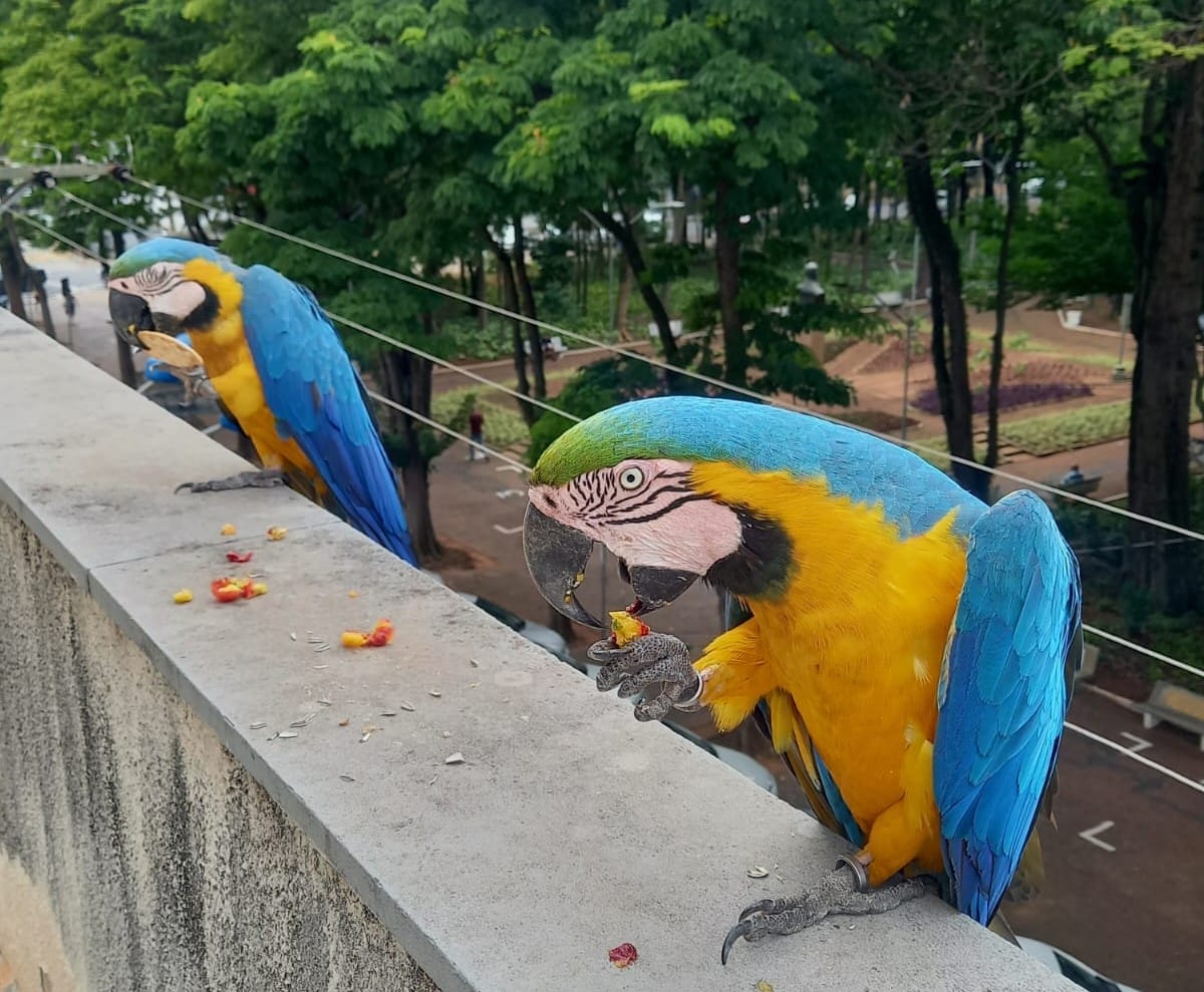 Duas araras da espécie Canindé, que aparentam ser um casal, têm feito as manhãs dos servidores do Paço Municipal mais alegres. Desde a segunda-feira (28) que os animais têm aparecido na sacada do prédio, no trecho da Avenida 3, defronte com o Jardim Público.