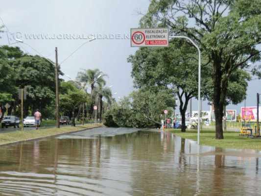 Na Avenida Brasil, outro espécime também não suportou a velocidade dos ventos. O mesmo se deu na Visconde do Rio Claro entre as ruas 11 e 12, e na Avenida Presidente Kennedy. Homens da prefeitura trabalharam duro para remover as árvores e os galhos para liberar o trânsito. Na Avenida Francisco Matarazzo, em frente ao Shopping Center RC, um enorme galho também acabou caindo. Na Rua 1 com a Avenida 5, no Centro, a fachada de um varejão foi derrubada, danificando ao menos cinco veículos. Ainda na região central, dessa vez na Rua 4 com a Avenida 8, a chuva alagou a via, arrastando motos que estavam estacionadas.