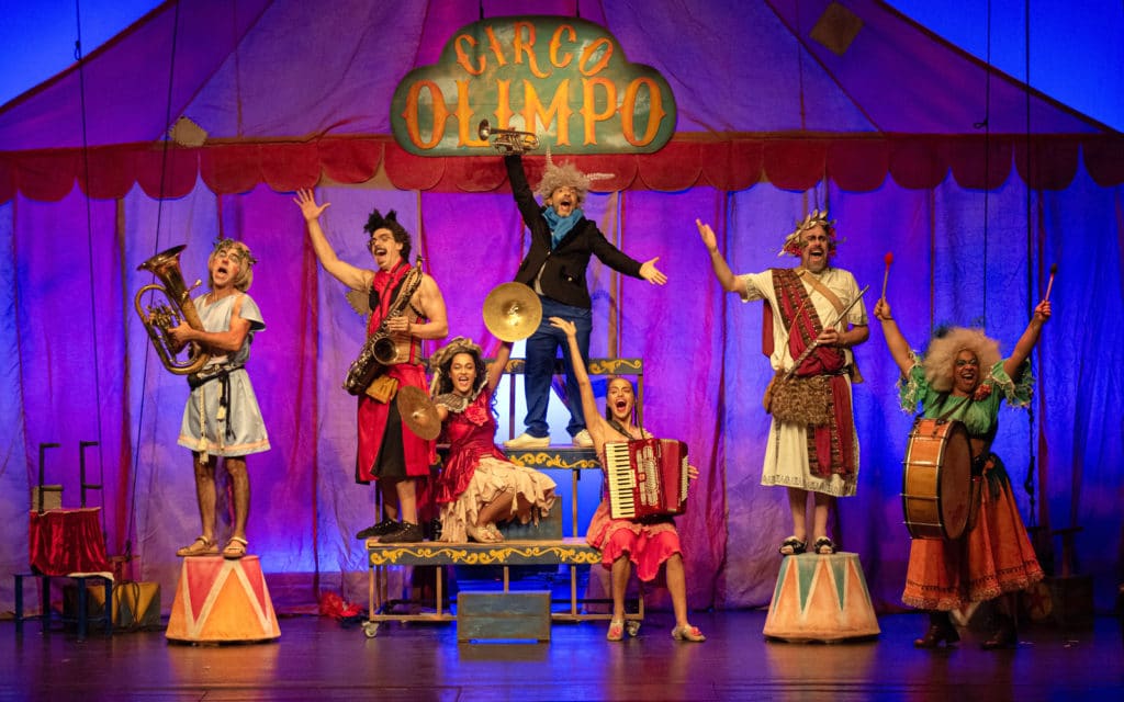 No espetáculo, Dionísio chega ao Olimpo para reivindicar a atenção de seu pai Zeus. Filho bastardo, encontra-se no Panteão com deusas e deuses, no momento em que deliberam quem descerá à Terra para acudir a humanidade, mais uma vez à beira da extinção. Apolo é escolhido e encaminhado para um circo mambembe, o território de Dionísio, deus do teatro. Através de seus disfarces, este enreda a trupe em estratagemas para mostrar que conhece mais a natureza dos humanos do que seu meio-irmão, Apolo.