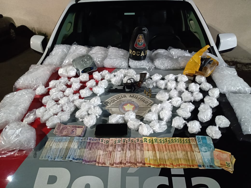 Na residência onde ele mora também foi abordada a namorada e ambos confessaram que no local realizam o refino e embalo de drogas. Foram apreendidos 33 mil eppendorfs vazios, 2624 pinos com cocaína, duas porções brutas de cocaína, 35 porções de maconha, R$ 661,00, um revólver calibre 38 e munições.