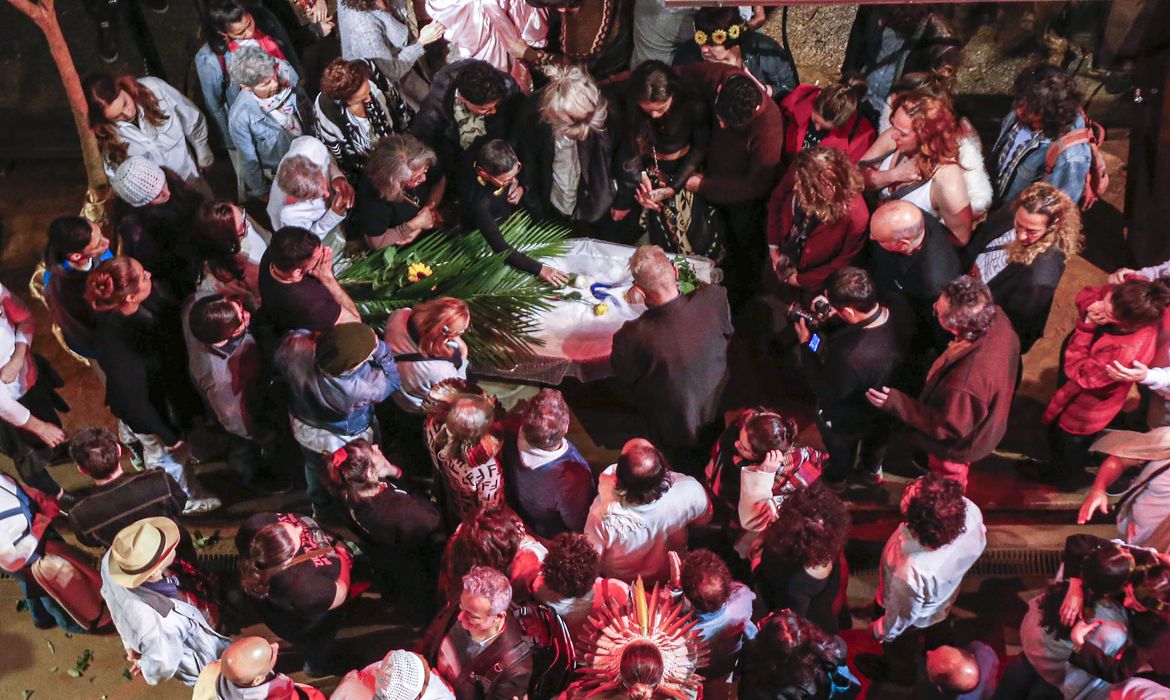 A despedida ocorre da forma como Zé Celso vivia: cercado de amor e espalhando alegria. No início desta noite, ainda esperando pela chegada do corpo do diretor, amigos e atores do Oficina organizaram um grande cortejo pelo palco, o qual foi concebido pela arquiteta Lina Bo Bardi. Palco esse que inovou a concepção de teatro ao colocá-lo no centro, como se fosse um corredor, com a plateia nas laterais, se enfrentando como se estivessem em um ringue. “O cenário no ringue representa a metáfora da luta”, dizia Zé Celso sobre a premiada arquitetura do teatro.