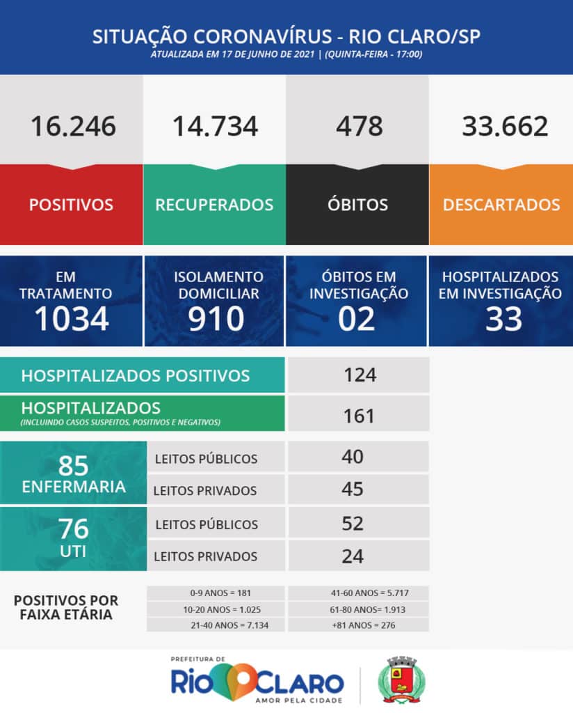 Os casos positivos de Covid em Rio Claro aumentaram em 172, conforme boletim divulgado na quinta-feira (17) pela Secretaria Municipal de Saúde. Com isso, o município totaliza 16.246 casos da doença, que fez mais duas vítimas fatais no município. Um homem e um idoso faleceram por conta da Covid, elevando para 478 o total de óbitos nesta pandemia.
