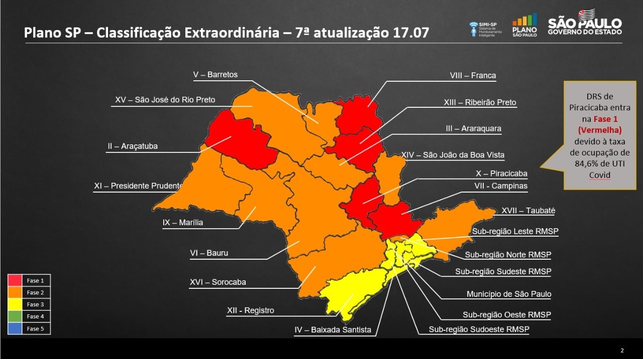 Em entrevista coletiva nesta sexta-feira (17), o governador João Doria anunciou a volta da região de Piracicaba à Fase 1, ou Fase Vermelha, do Plano SP, a partir de segunda-feira (20). Com a decisão, cidades da região que haviam retornado à Fase Laranja (após autorização do governo do estado na última sexta, dia 10), como Cordeirópolis e Santa Gertrudes, terão que novamente fechar seu comércio. Rio Claro e Piracicaba já haviam decidido não retornar à Fase Laranja. Segundo o governador, a região regride à Fase Vermelha devido ao número de casos e ocupação de leitos de UTIs.