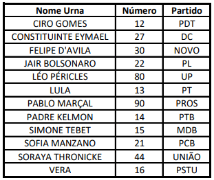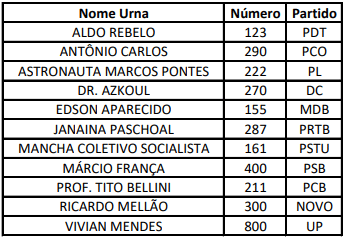 No próximo dia 2 de Outubro teremos as eleições gerais e neste ano de 2022 os eleitores terão de realizar a escolha de cinco votos para os seguintes cargos: Presidente, Governador, Senador, Deputado Estadual e Deputado Federal. Para facilitar a escolha do seu voto, o Jornal Cidade traz a lista de todos os candidatos para os cargos disputados neste ano, com destaque para os candidatos ao Legislativo pelo Estado de São Paulo. Confira abaixo a lista com os nomes, números e partidos de cada concorrente às vagas no executivo e legislativo:
