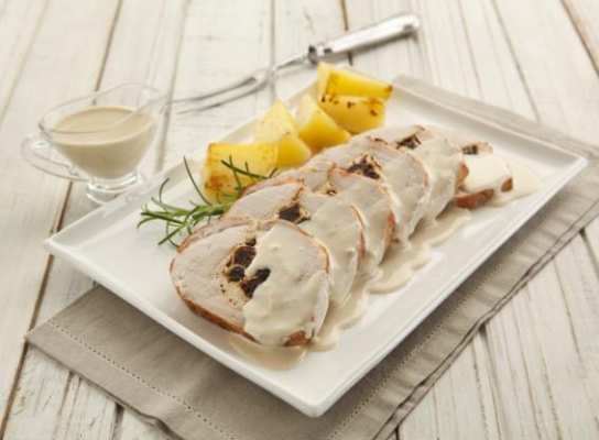 – Na mesma panela, com o caldo da cocção, adicione o restante do creme de queijo, misturando bem para homogeneizar o molho, e deixe até levantar fervura. Espalhe o molho sobre o lombo e sirva em seguida, acompanhado de batatas ao forno.