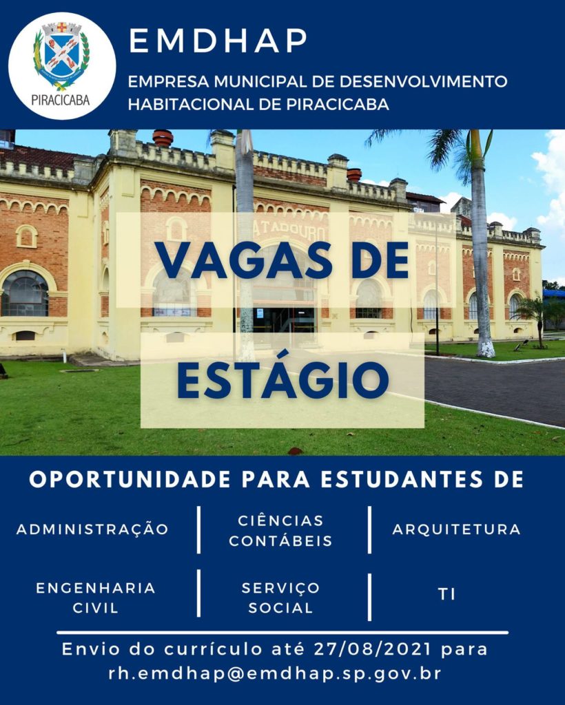 A Empresa Municipal de Desenvolvimento Habitacional de Piracicaba (Emdhap) está com inscrições abertas do programa de estágio 2021/2022, para estudantes do ensino superior nos cursos de:
