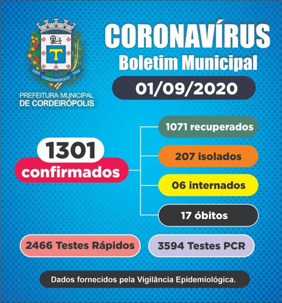Cordeirópolis tem 1301 casos confirmados de coronavírus.