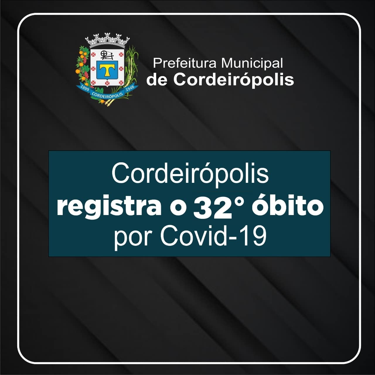 A Secretaria de Saúde de Cordeirópolis confirmou neste domingo (28), o 32º óbito em decorrência da Covid-19. Trata-se de uma senhora de 84 anos de idade.