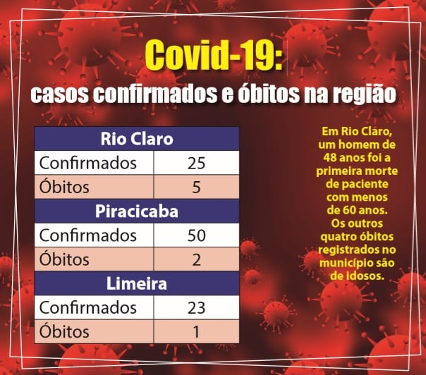 No último domingo (19), foi registrado o quinto óbito causado pelo novo coronavírus. A vítima é um homem de 48 anos, sendo a primeira morte de pessoa com menos de 60 anos decorrente da doença. Os outros quatro registrados em Rio Claro são de idosos. O município tem um óbito suspeito em investigação.