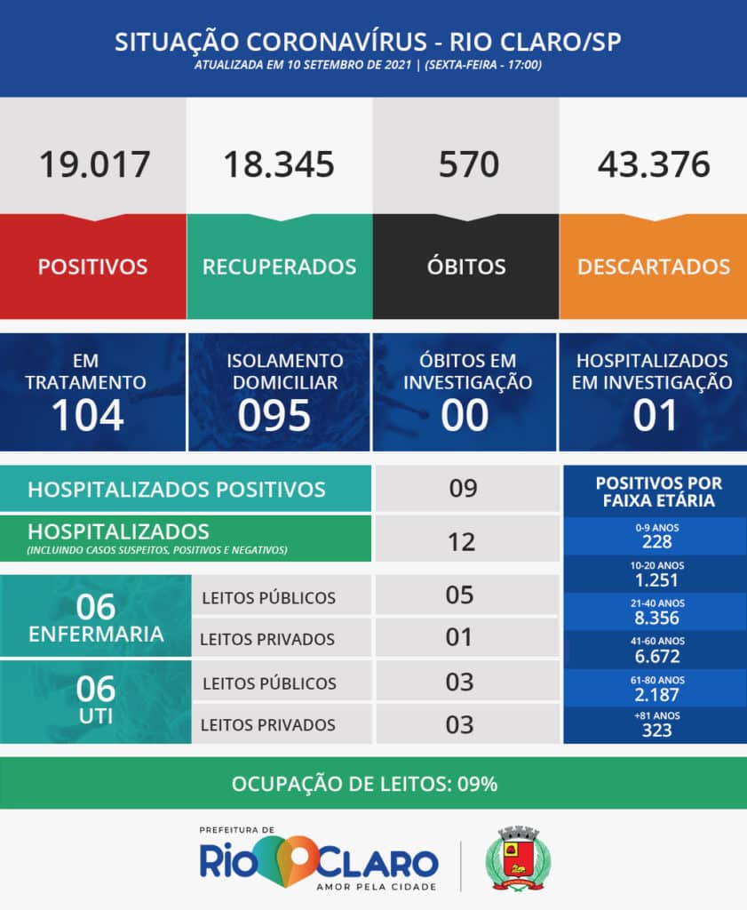 Com a morte de um idoso por Covid em Rio Claro, são 570 pessoas que perderam a vida no município por conta da doença. As informações foram divulgadas nesta sexta-feira (10) pela Secretaria Municipal de Saúde, que também aponta 14 novos casos de coronavírus, totalizando 19.017.