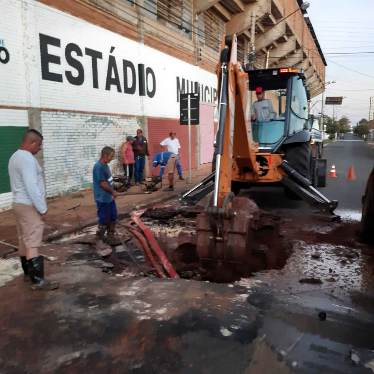 O Daae (Departamento Autônomo de Água e Esgoto) de Rio Claro está fazendo, no final da tarde desse domingo (18), reparo emergencial em adutora de 250 milímetros que se rompeu na Rua 3, entre as avenidas 19 e 21, em frente ao estádio municipal Benito Agnelo Castellano, no bairro Jardim Donangela.