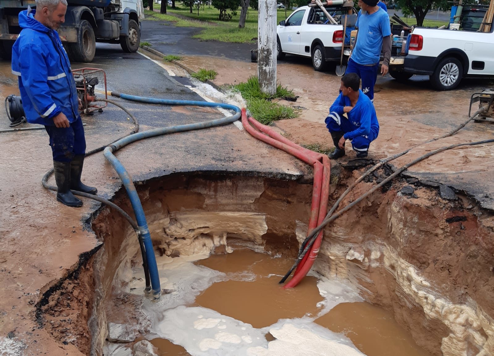O Daae (Departamento Autônomo de Água e Esgoto) de Rio Claro está fazendo reparo emergencial em adutora de 250 milímetros que se rompeu na Avenida Brasil, entre as Avenidas M-35 e M-37, no bairro Jardim Floridiana.