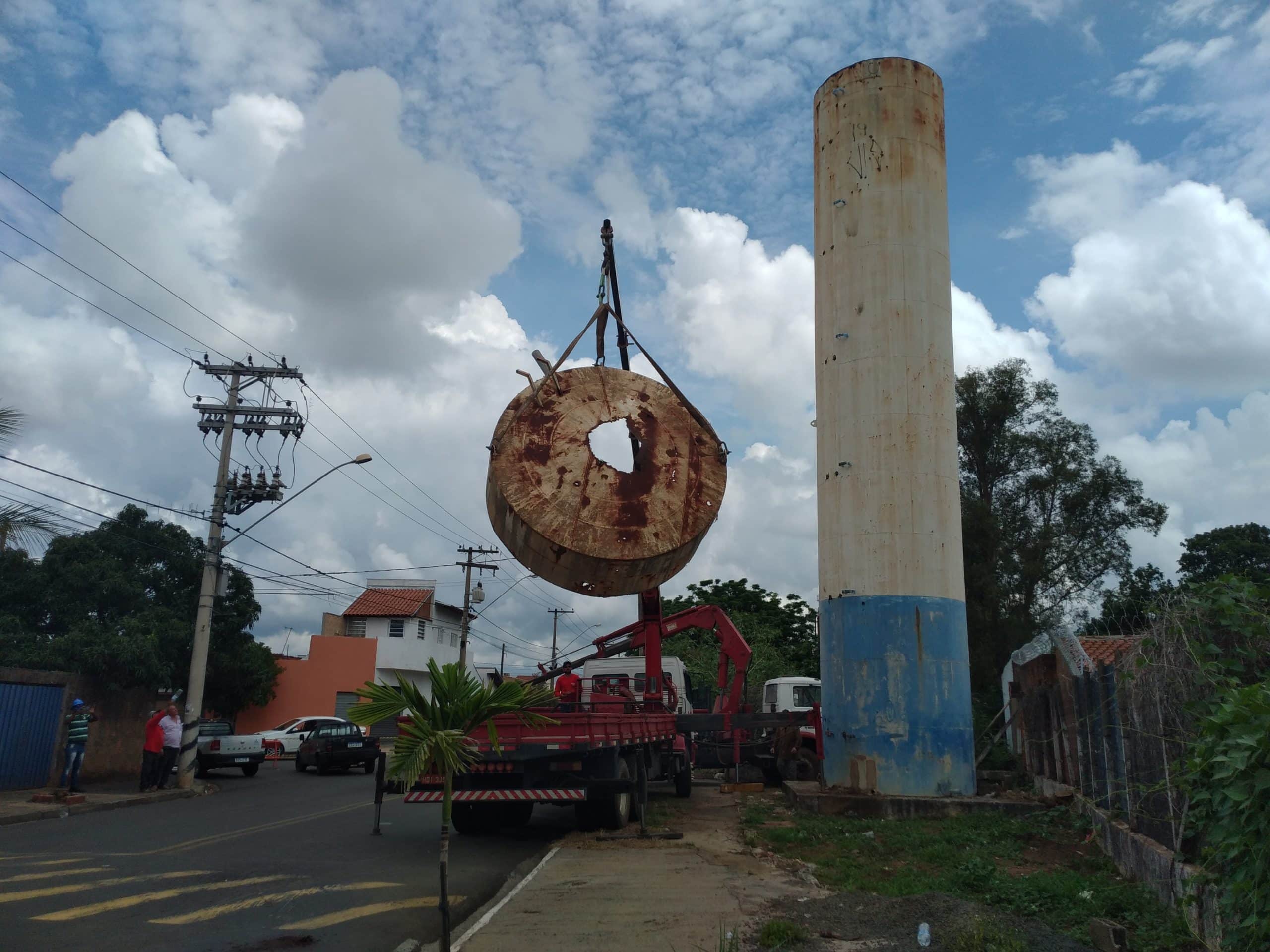 Para a retirada do reservatório, que tinha capacidade para 80 mil litros de água, foi necessário remover a escada e pequenas tubulações no entorno da estrutura, além de cortar partes do reservatório com maçarico, principalmente o topo, bastante danificado pela ação do tempo. Depois, com o auxílio de dois caminhões Munck (guindastes compostos por braço hidráulico de içamento), as demais partes foram retiradas.